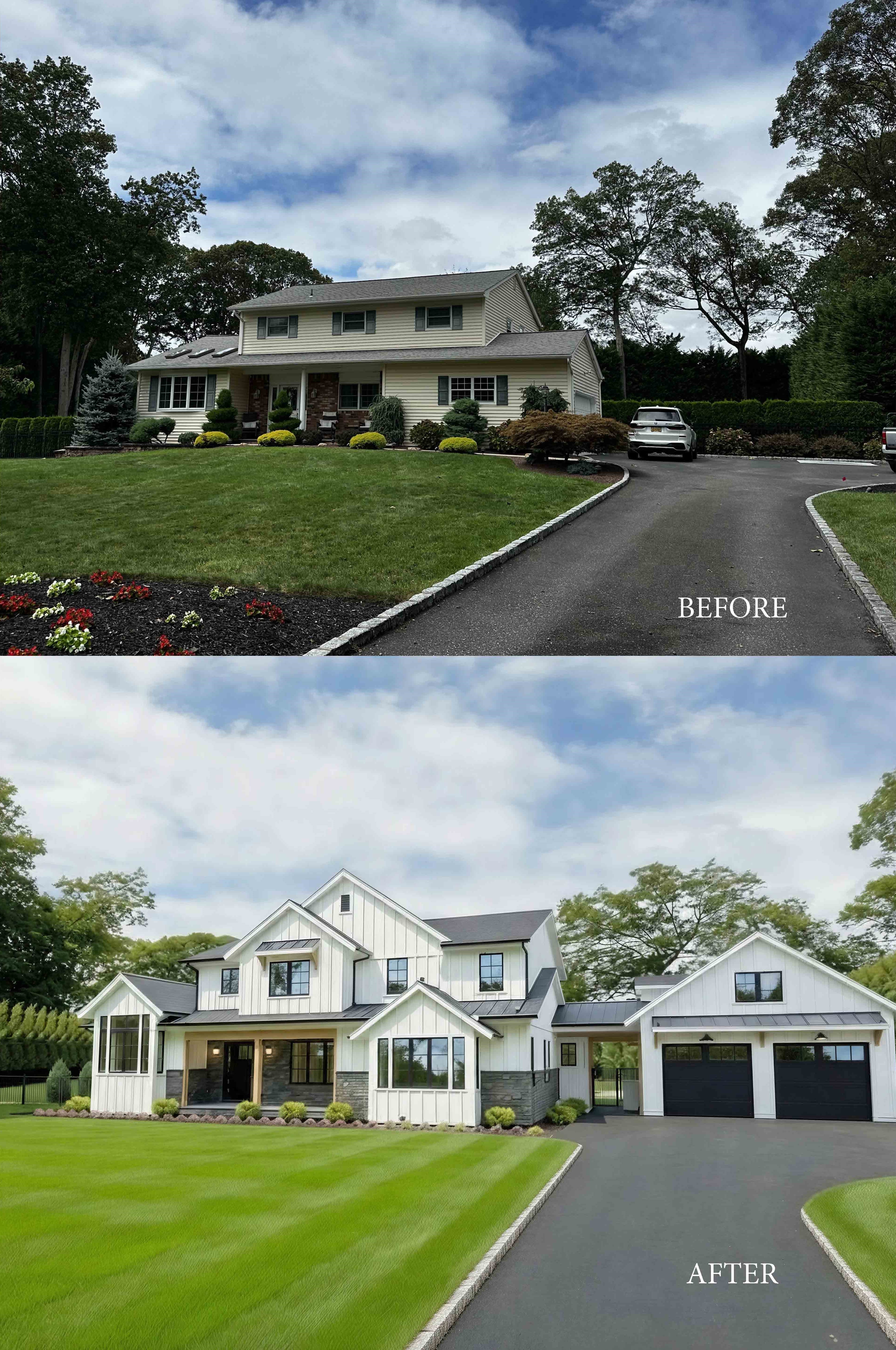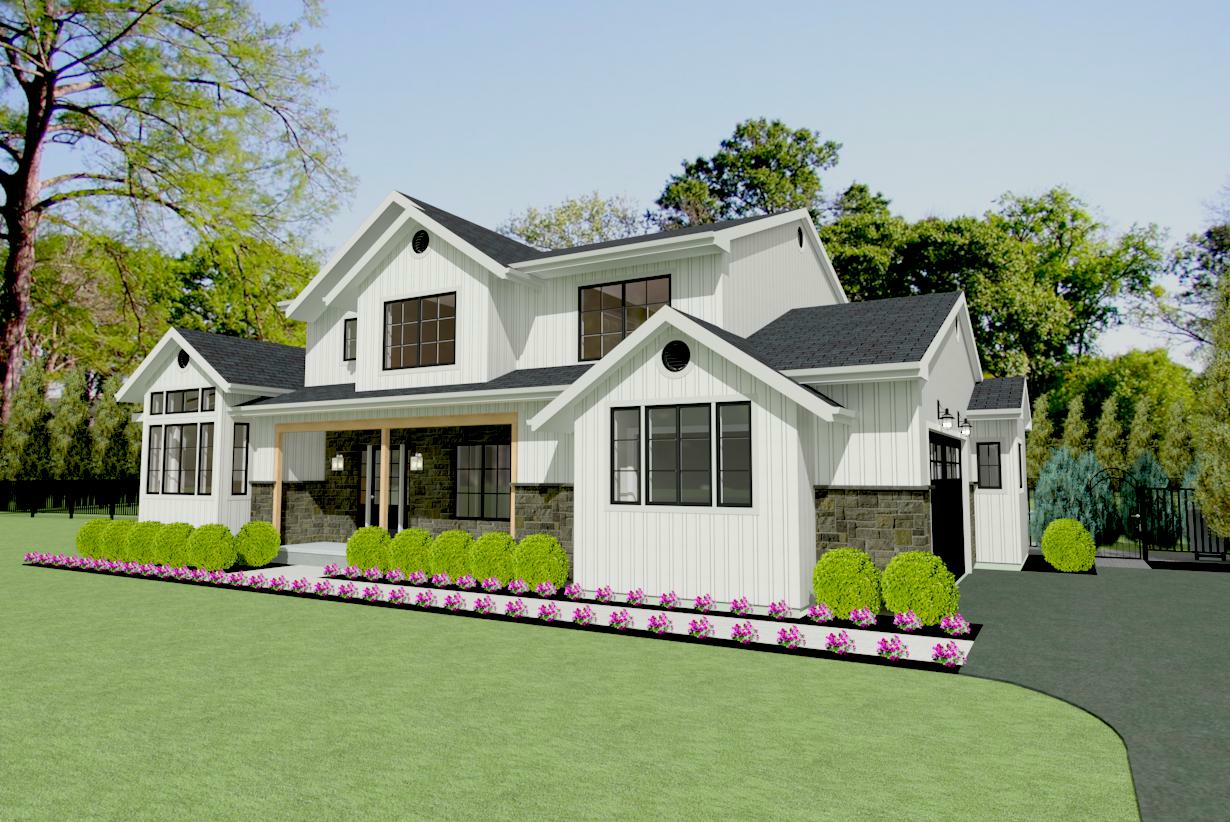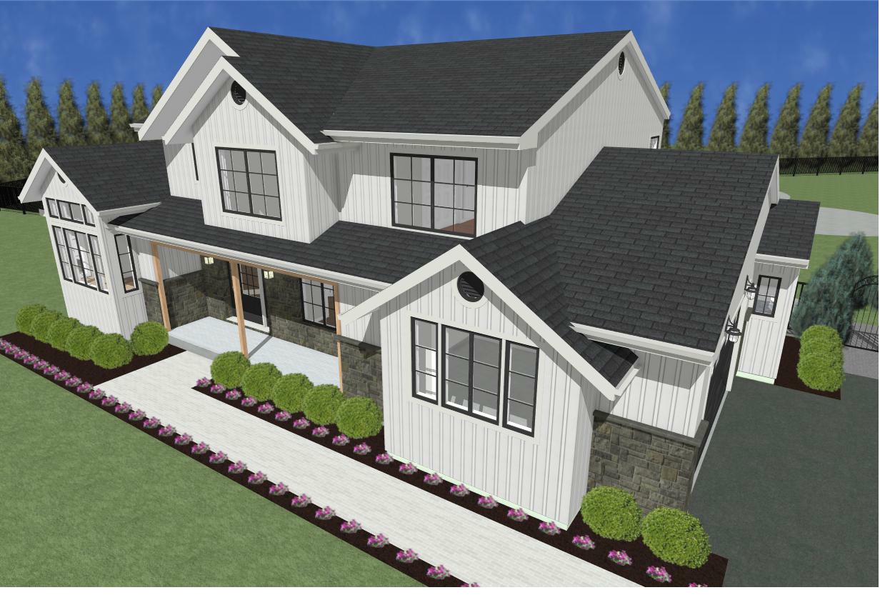 A complete exterior transformation of an existing two-story colonial — new board-and-batten siding, cultured stone base and entry surround, all-new roof and eaves profile. Strategic additions amplified the design: a garage workspace wing, a new window seat with heightened living room windows, and a second-floor bump-out that expanded a small bedroom into a high-impact new gable. At the rear, a new Mud and Laundry Room addition creates a more convenient rear entry off the pool, while a replanned first floor delivers an open eat-in kitchen with large island and pantry flowing into the family room with fireplace views.