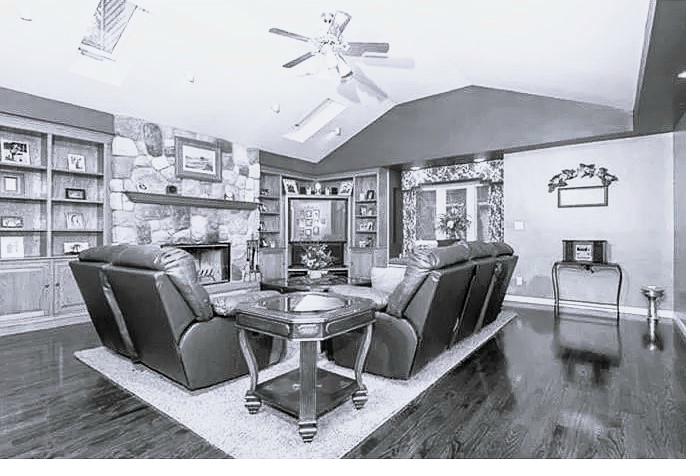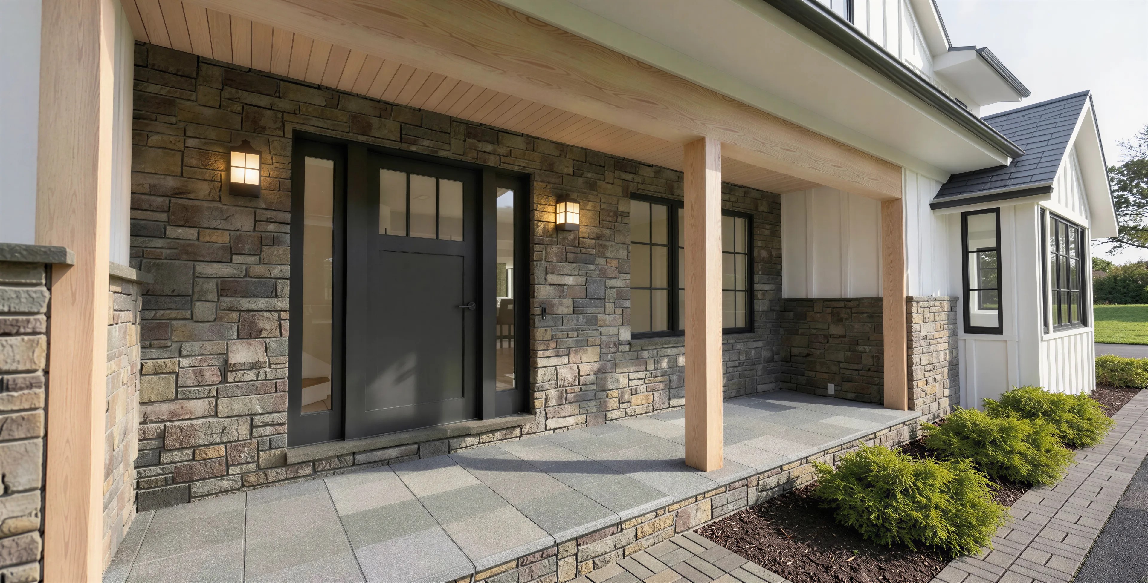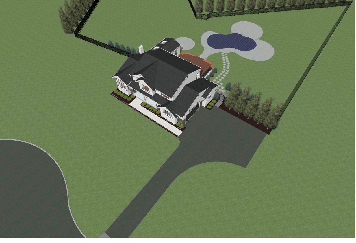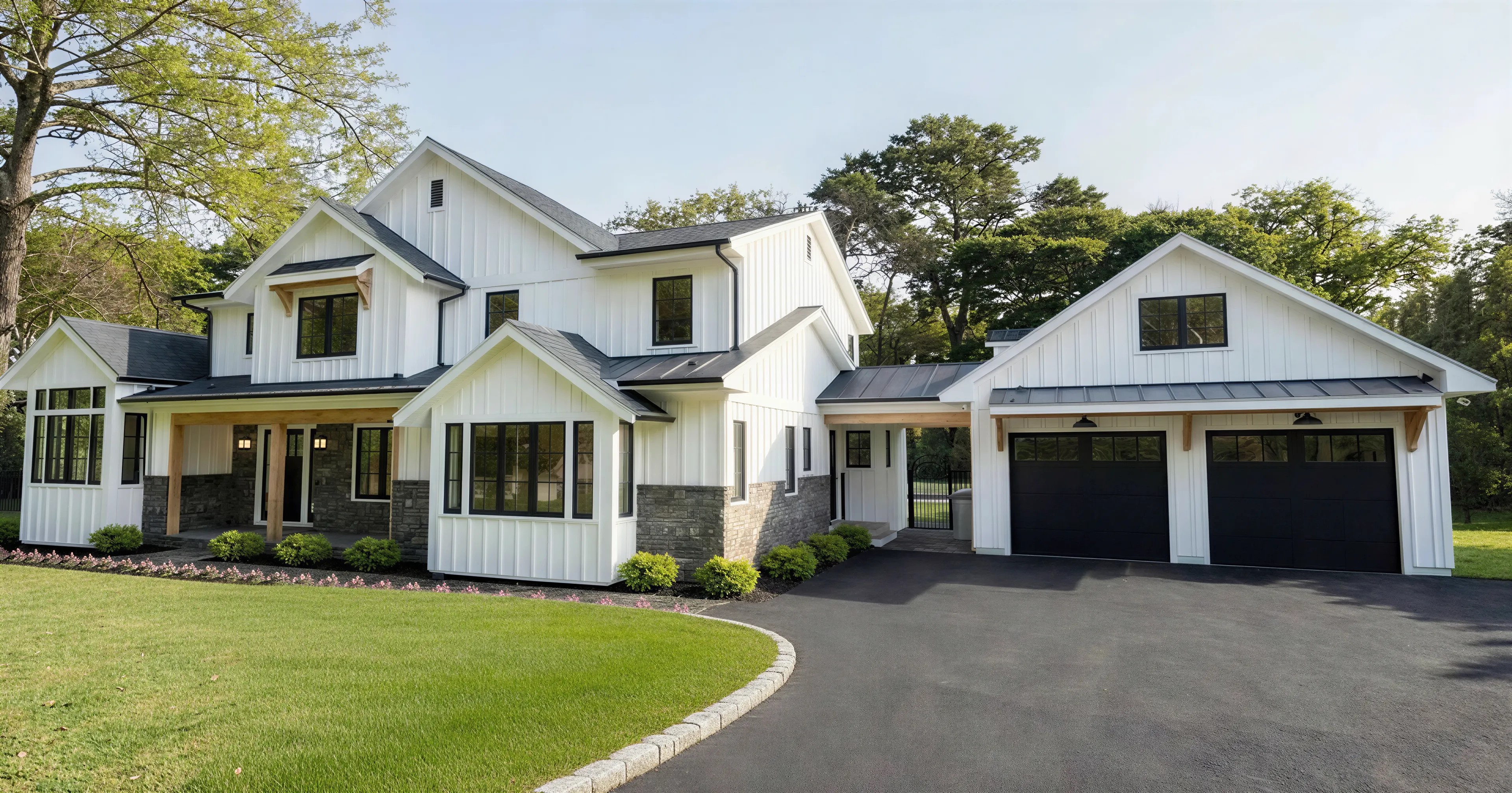 A complete exterior transformation of an existing two-story colonial — new board-and-batten siding, cultured stone base and entry surround, all-new roof and eaves profile. Strategic additions amplified the design: a garage workspace wing, a new window seat with heightened living room windows, and a second-floor bump-out that expanded a small bedroom into a high-impact new gable. At the rear, a new Mud and Laundry Room addition creates a more convenient rear entry off the pool, while a replanned first floor delivers an open eat-in kitchen with large island and pantry flowing into the family room with fireplace views.